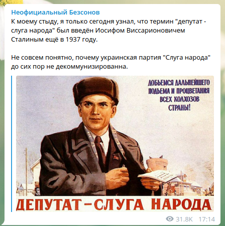 "К моему стыду, я только сегодня узнал, что термин "депутат - слуга народа" был введён Иосифом Виссарионовичем Сталиным ещё в 1937 году, - сообщает автор поста. - Не совсем понятно, почему украинская партия "Слуга народа" до сих пор не декоммунизирована".