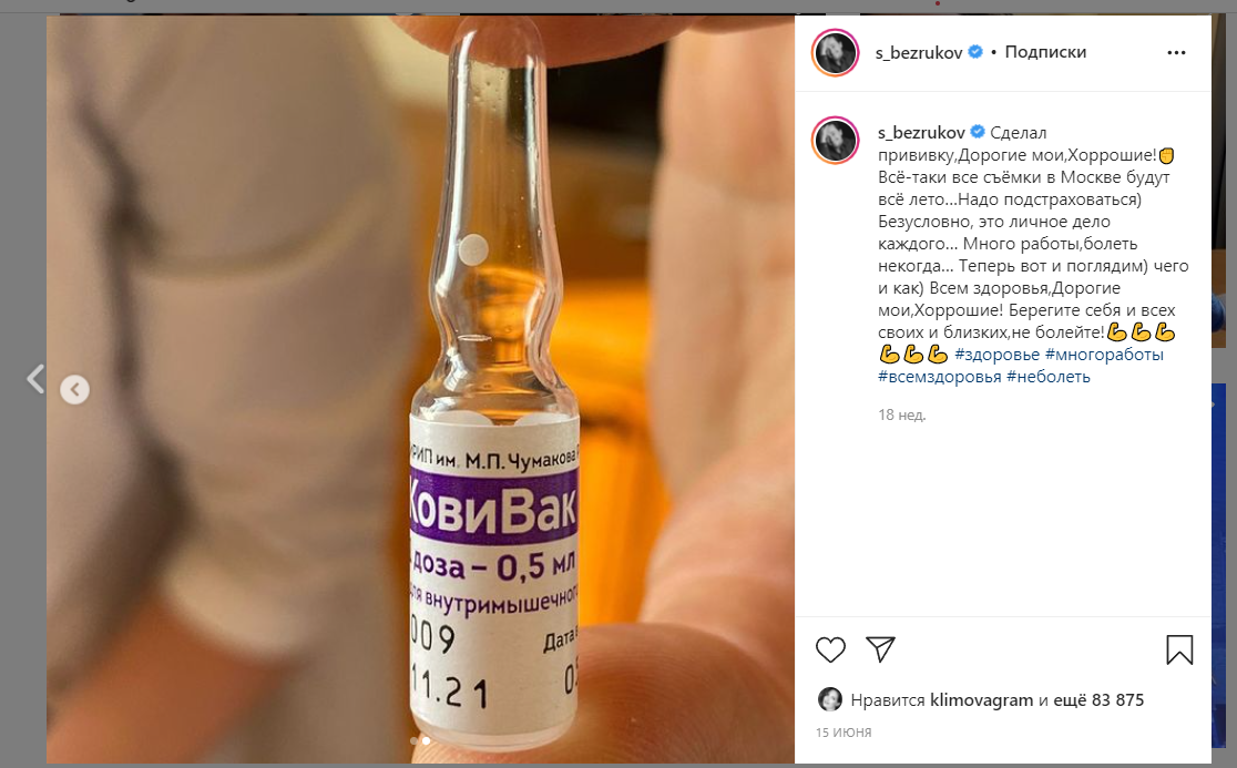 По словам Безрукова, он сделал прививку ещё 4,5 месяца назад и теперь надеется, что переболеет легко. Подписчики нашли его пост от 15 июня, подтверждающий, что их кумир действительно прививался от коронавируса: на видео актёру делают инъекцию.