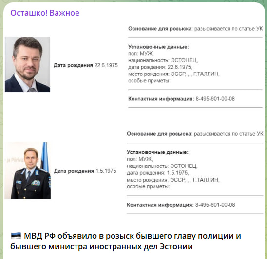 МВД России объявило в розыск бывшего начальника полиции Эльмара Вахера и экс-главу МИД Эстонии Урмаса Рейнсала по уголовной статье - причём в этот раз она даже известна, в отличие от объявленных ранее в розыск Зеленского и Порошенко.