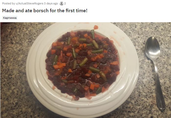 ActualSteveRogers опубликовал фотографию на доске, посвящённой России. Он похвастался: варил борщ впервые. На тарелке можно различить кубики свёклы, моркови и… стручковой фасоли. А вот бульона почти нет.