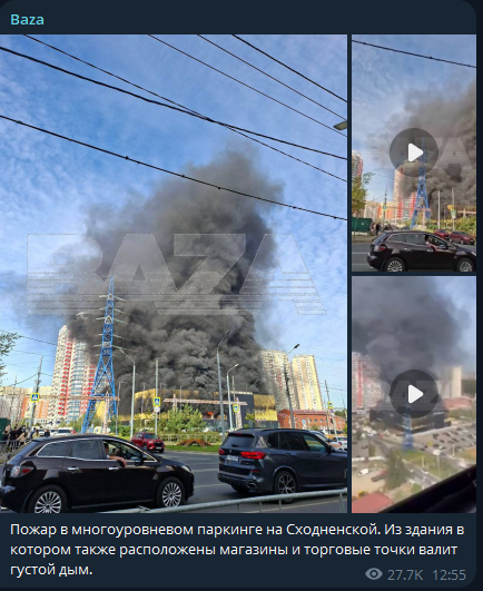 Пожар в многоуровневом паркинге на Сходненской. Из здания в котором также расположены магазины и торговые точки валит густой дым,