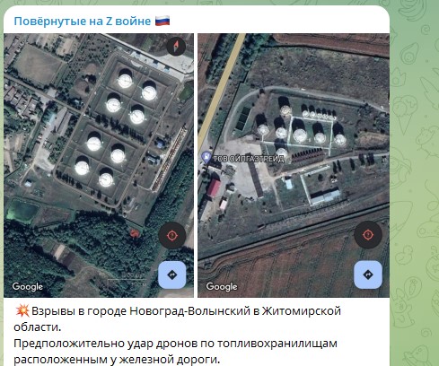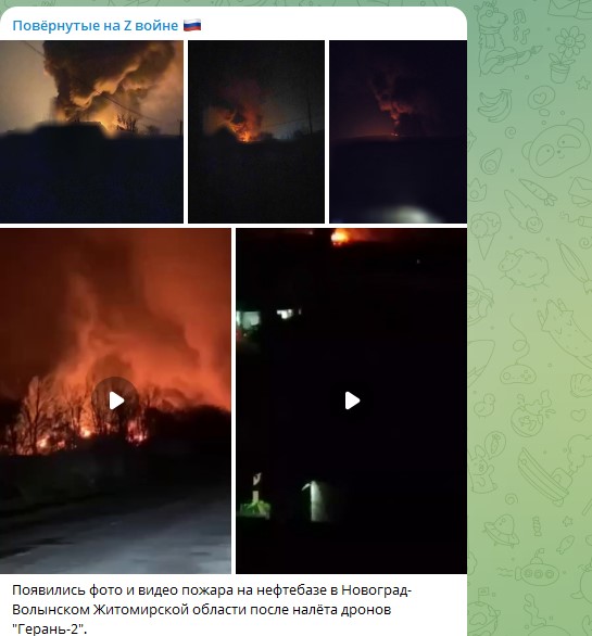 Телеграм-каналы публикуют фото и видео пожара на нефтебазе в Новограде-Волынском Житомирской области после налёта русских дронов "Герань-2".