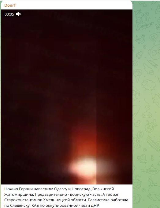 По данным донецкого блогера Donrf, минувшей ночью "Герани" "навестили" не только Житомирскую область, но и Одессу. По предварительным данным, поражена также воинская часть и аэродром Староконстантинов в Хмельницкой области.
