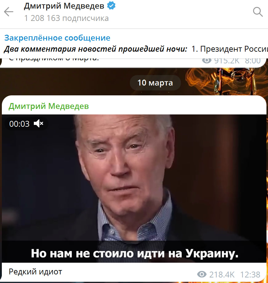 Эта оговорка у публичных лиц России вызвала лишь одну реакцию - недоумение. Так, зампред Совбеза России Дмитрий Медведев констатировал: Байден - "редкий идиот". Свой комментарий он сопроводил видеонарезкой, где президент США произносит столь странную оговорку.