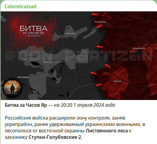 Эксперт Центра военно-политической журналистики Борис Рожин отмечает несколько факторов, осложняющих передвижение нашей группировки к Часову Яру - с востока город прикрыт цепью укреплений, расположенных вдоль береговой линии канала Северский Донец - Донбасс. Сам населённый пункт находится на возвышении, а подступы к нему прикрыты четырьмя опорниками, однако заметно, что украинское командование начинает сильно нервничать, что видно по их решениям. Особенно заметно это стало после освобождения русской армией Богдановки.