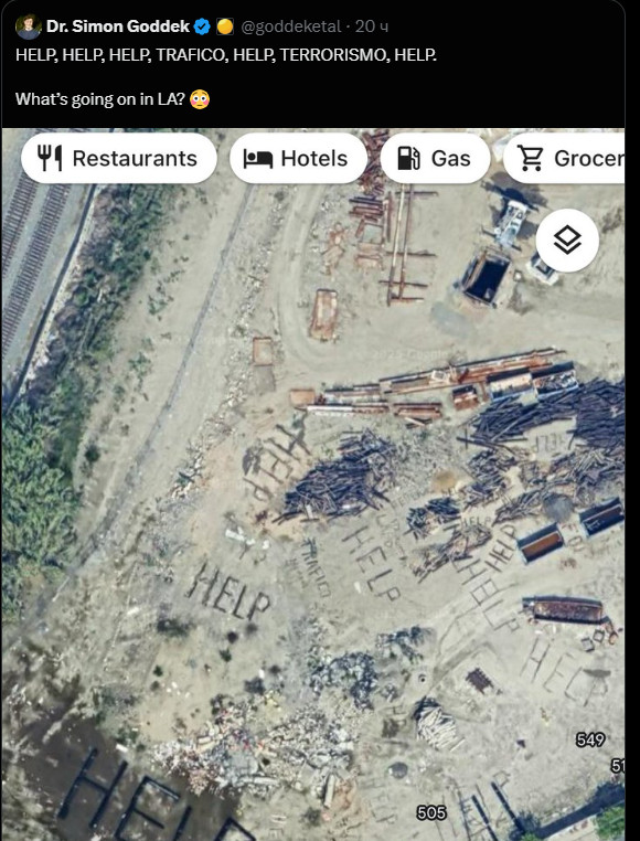 Пост со скриншотами Google Maps опубликовал в X пользователь goddeketal. На снимках хорошо различимы буквы Help. Таких надписей множество. Они находятся на земле, рекламных щитах, на мосту. Все мольбы о помощи сконцентрированы в одном районе – у бетонного канала реки Лос-Анжелес.