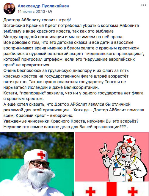 Страсти по Айболиту: В Эстонии требуют убрать изображение красного креста с костюма сказочного героя