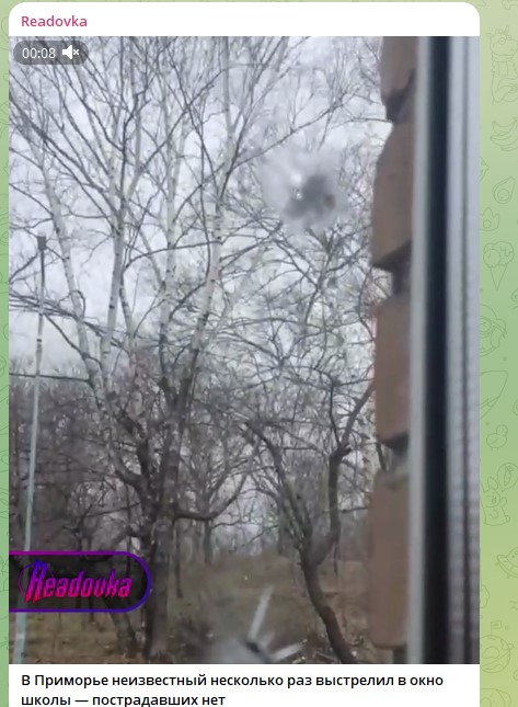 По данным Readovka, неизвестный мужчина пять раз выстрелил в окно школы в Партизанске. На кадрах очевидцев видны характерные следы от пуль на окне.