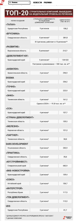 Лидером среди застройщиков по числу регионов по итогам 2024 года является девелоперская компания "Талан", штаб-квартира которой находится в столице Удмуртии, Ижевске. По состоянию на 1 мая 2025 года, согласно информации Единого ресурса застройщиков (ЕРЗ), застройщик возвёл жильё в девяти регионах России. Больше всего застройки насчитали в Хабаровском крае – 200 495 квадратных метров, что составляет 14,03% от доли всего местного рыка, а также в Татарстане – 184 776 квадратных метров (5,27% от доли местного рынка).