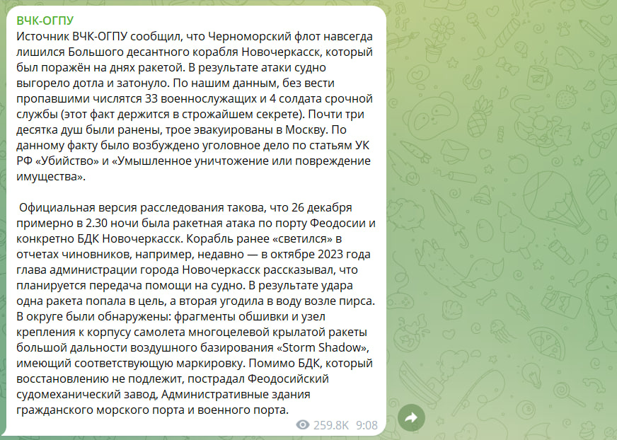 26 декабря русский Черноморский флот потерял крупный корабль "Новочеркасск". Гибель судна случилась в результате украинской атаки ракетой Storm Shadow.