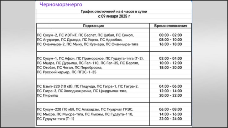 11 декабря Абхазия перешла на подачу энергии с ГЭС населению на 2 часа 48 минут в дневное время и с 21:00 до 07:00 без ограничений за счёт поставок из России. А 8 января стала исчезать даже российская дармовая энергия - ни в больницах, ни в детсадах, ни в жилых домах её так и не увидели.