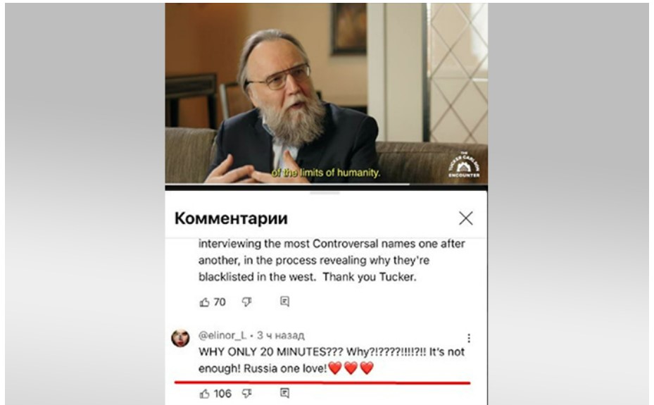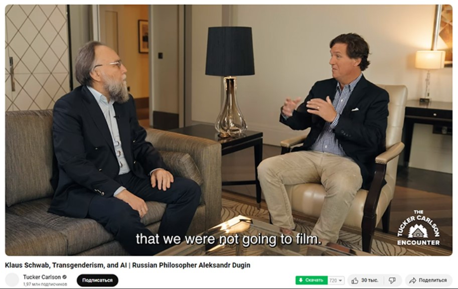 Интервью вышло на канале Карлсона и в соцсети X. Меньше чем за сутки число просмотров этой беседы достигло полумиллиона. Нельзя сказать, что Дугин говорит о простых и понятных вещах, однако его смотрят техасские фермеры, домохозяйки, консерваторы из южных штатов и просто здравомыслящие люди в Америке. Комментариев тысячи, подавляющее большинство - на английском языке.