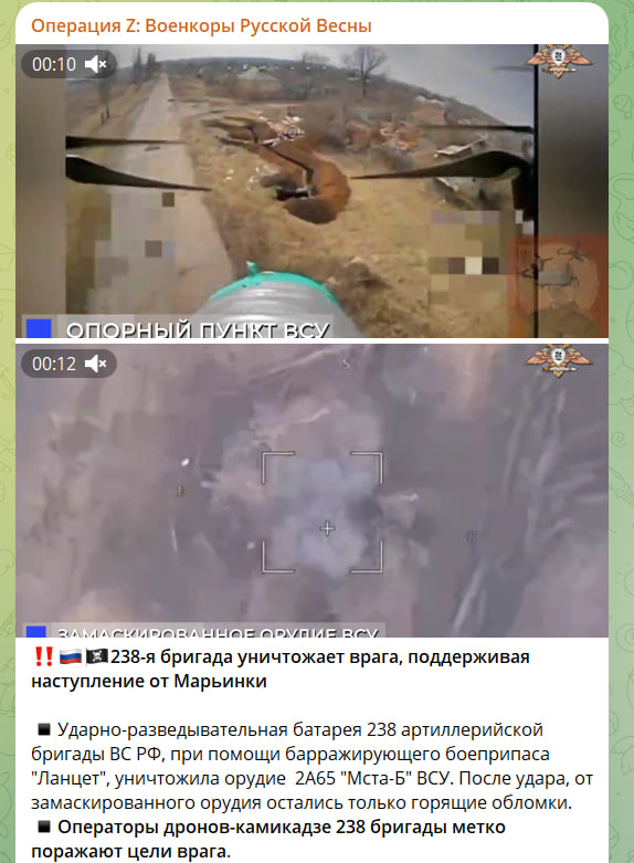 На одном из кадров можно увидеть ударно-разведывательную батарею 238-й артиллерийской бригады ВС РФ, которая при помощи барражирующего боеприпаса "Ланцет" уничтожила орудие 2А65 "Мста-Б" ВСУ.