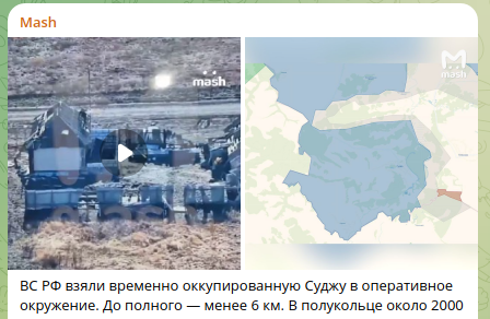 Mash сообщает, что временно оккупированную Суджу взяли в оперативное окружение. Внутри оказались отрезанными 2000 солдат, которых командование ВСУ обрекло на гибель. Решающей страла минувшая ночь.