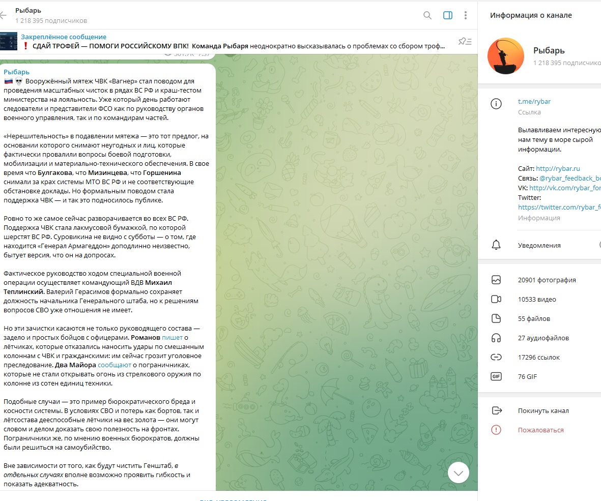 Сегодня утром команда военного блогера Михаила Звинчука в телеграм-канале "Рыбарь" сообщила о большой работе следователей в Вооружённых силах России в целом и в Минобороны России в частности. По большому счёту, говорится в анализе, попытка вооружённого мятежа в стране, стала краш-тестом министерства на лояльность: