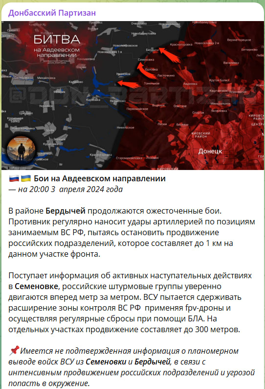 В н.п. Бердычи ВС РФ после прорыва вдоль южных окраин усиливают нажим на центральные части посёлка. Противник пока удерживается в северо-западной части посёлка и предпринимает контратаки к северу от Бердычей, чтобы не допустить отрезание своих сил в районе посёлка. Дальнейшее продвижение ВС РФ к юго-западу от н.п. Бердычи, а также к западу от н.п. Тоненькое, скорее всего, приведёт к скорому оставлению противником Семёновки.