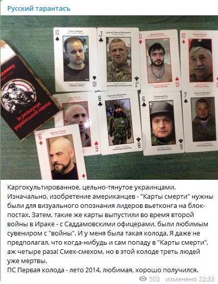 "Каргокультированное, цельно-тянутое украинцами. Изначально, изобретение американцев - "Карты смерти" нужны были для визуального опознания лидеров вьетконга на блок-постах. Затем, такие же карты выпустили во время второй войны в Ираке - с Саддамовскими офицерами, были любимым сувениром с "войны". И у меня была такая колода. Я даже не предполагал, что когда-нибудь и сам попаду в "Карты смерти", аж четыре раза! Смех-смехом, но в этой колоде треть людей уже мертвы. ПС Первая колода - лето 2014, любимая, хорошо получился".