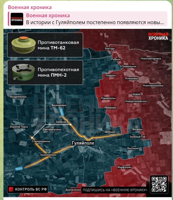 Южнее, в Запорожской области, русские, овладев Малой Токмачкой, продвигаются к Орехову. На Гуляйпольском направлении, севернее, противник усиленно минирует поля и дороги, рассчитывая, видимо, выиграть время. Но наступление русских это пока не особо сдерживает.