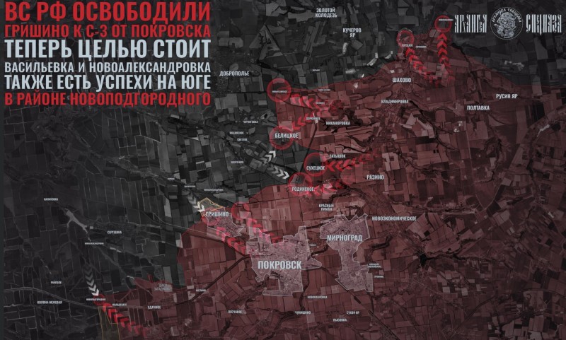 Бои за село Гришино, что к северо-западу от Покровска начались ещё несколько месяцев назад, ещё даже до полной зачистки Покровска и Мирнограда. Именно отсюда Сырский пытался вводить в бой элитные резервы в бесплодных попытках деблокировать окружённую русскими агломерацию. После провала "контрнаступа" остатки украинских подразделений плотно окопались в Гришино, весьма крупном селе.