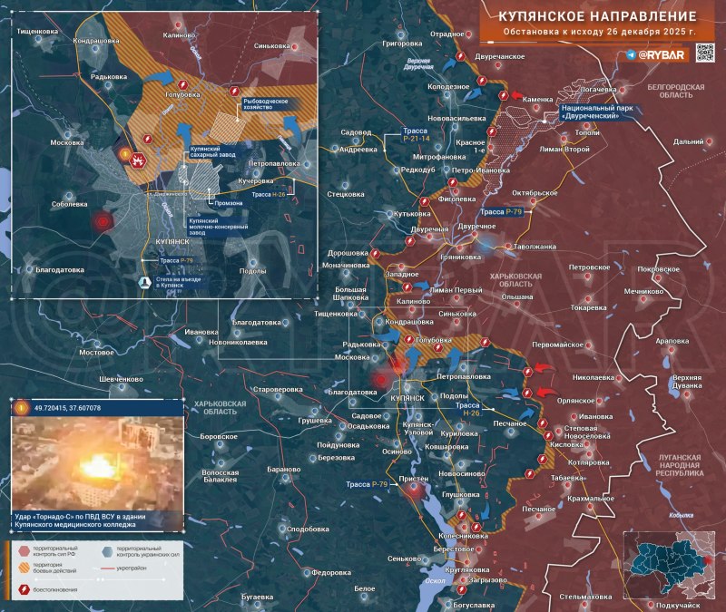 Обстановка на Купянском участке фронта остаётся напряжённой. По информации военных корреспондентов, украинские силы сосредоточили свои основные силы в районе Купянска. "Царьград" пристально следит за ситуацией, о том, что происходило 25 декабря можно прочитать здесь, 26 декабря - здесь.