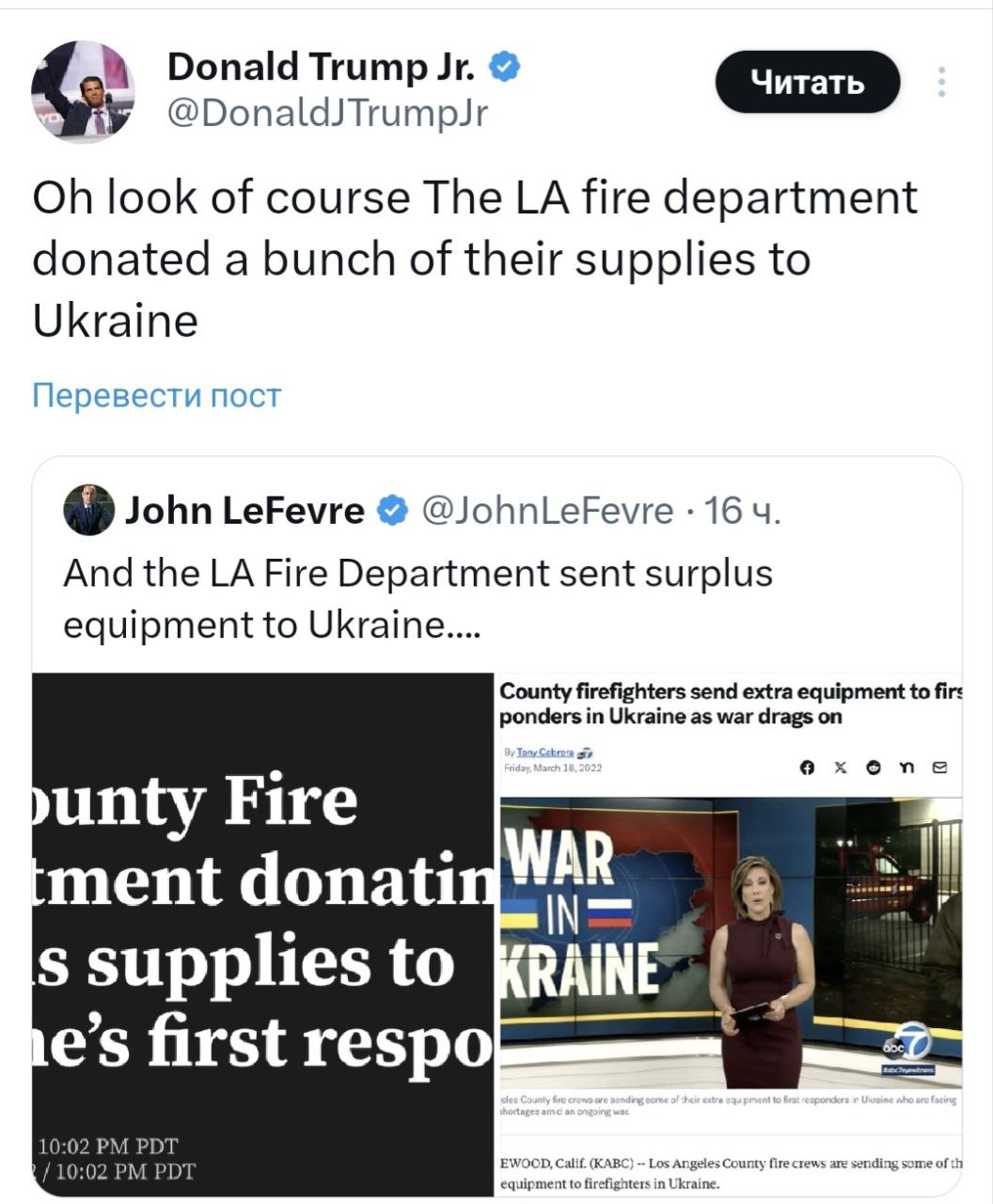 В этой связи Трамп-младший припомнил новостные сюжеты, где рассказывается, что США отправили Украине часть своего оборудования. Поэтому стоит ли удивляться тому, что американцы не справляются с масштабом катастрофы.
