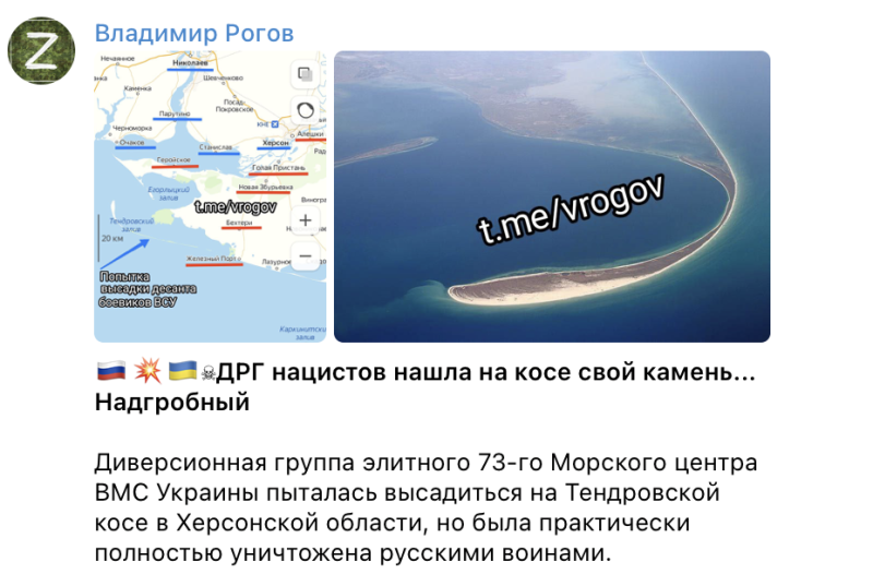 О провале диверсии под Херсоном сообщал 28 февраля глава движения "Мы вместе с Россией" Владимир Рогов. По его словам, диверсионная группа элитного 73-го морского центра ВМС Незалежной попыталась высадиться на Тендровской косе в Херсонской области, однако была уничтожена русскими силами.