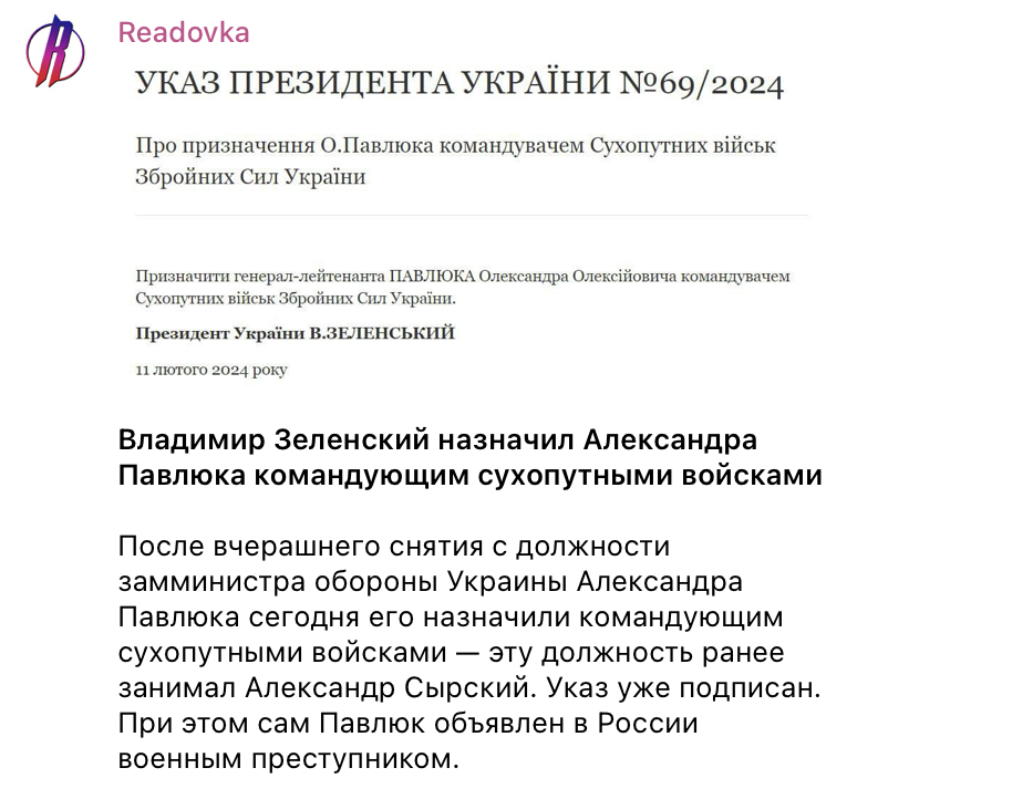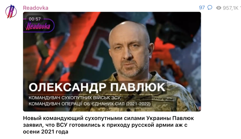 После повышения Сырского именно Павлюк занял его пустующее кресло. Фото: Скриншот t.me/readovkanews