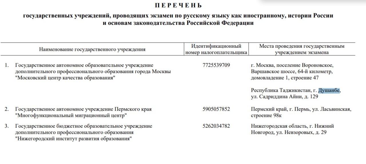 В Таджикистане, кажется, нашли способ обойти новый закон о сдаче экзамена на владение языком для детей мигрантов. В документах среди мест, где можно сдать экзамен по русскому, неожиданно появился нерусский город Душанбе.