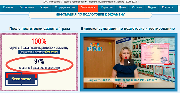 ШАНСОВ ПРОВАЛИТЬ "ЭКЗАМЕН" В КОММЕРЧЕСКОМ ЦЕНТРЕ У МИГРАНТА ПРАКТИЧЕСКИ НЕТ. ФОТО: СКРИНШОТ СТРАНИЦЫ САЙТА WWW.DOMMIGRANTA.RU