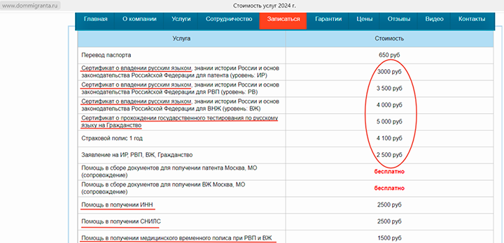 ВПОЛНЕ ДОСТУПНЫЕ УСЛУГИ - СРЕДНИЕ ПО РЫНКУ, КАК ГОВОРИТСЯ. ФОТО: СКРИНШОТ СТРАНИЦЫ САЙТА DOMMIGRANTA.RU
