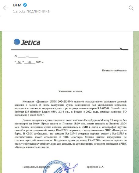 Кроме того, в том же письме сообщается, что воздушное судно с бортовым номером RA-02748 не имеет никакого отношения к ЧВК "Вагнер" и никогда не имело.