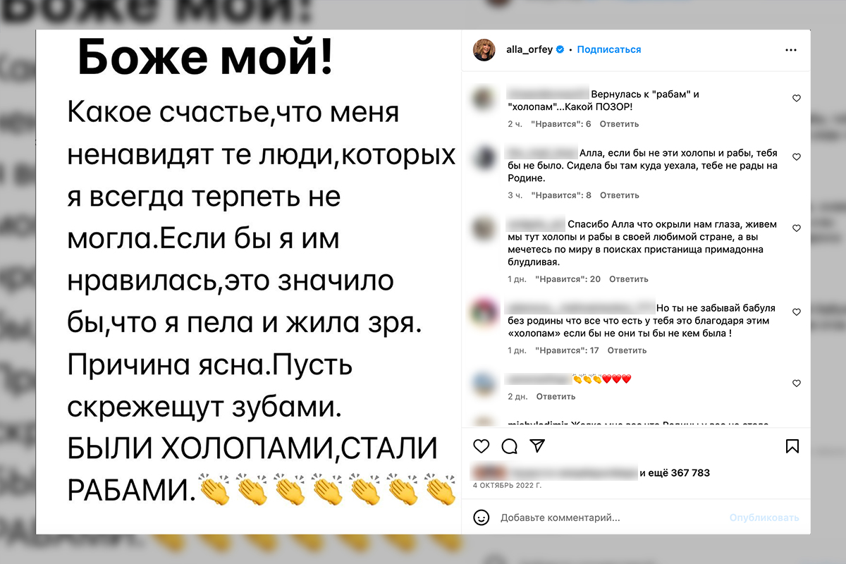 ТО САМОЕ РЕЗКОЕ ВЫСКАЗЫВАНИЕ ПУГАЧЁВОЙ В АДРЕС НЕ ПОДДЕРЖАВШИХ ЕЁ РУССКИХ. ФОТО © INSTAGRAM (СОЦСЕТЬ ЗАПРЕЩЕНА В РОССИИ; ПРИНАДЛЕЖИТ КОРПОРАЦИИ META, КОТОРАЯ ПРИЗНАНА В РФ ЭКСТРЕМИСТСКОЙ) / ALLA_ORFEY