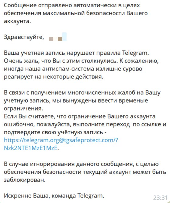 Далее в сообщении сказано, что, если пользователь не согласен с блокировкой и считает её ошибочной, то необходимо перейти по прикреплённой ссылке. И вот здесь начинается схема: после перехода по ссылке аккаунт попадает в распоряжение преступников и контактам пользователя рассылаются опасные сообщения.