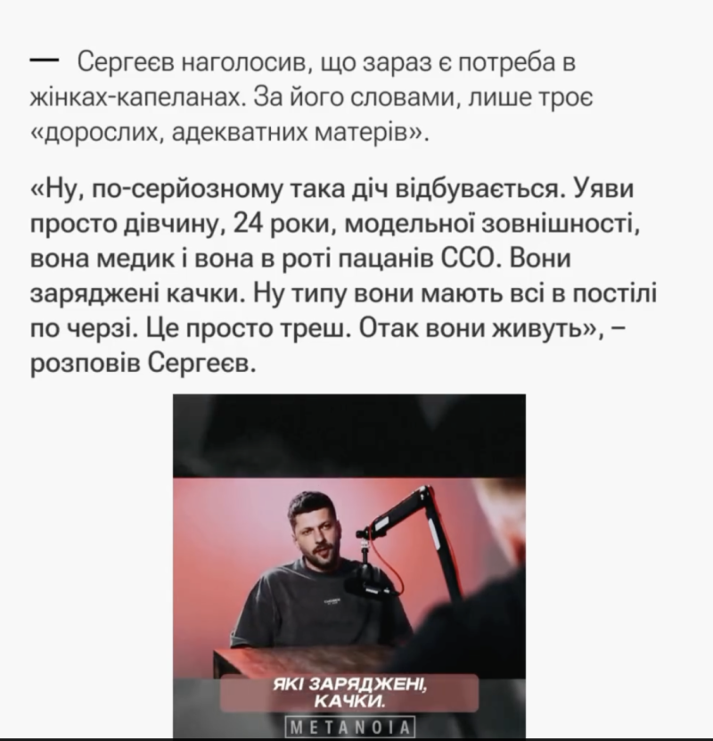 Украинский капеллан Марк Сергеев рассказал о блуде с медсёстрами на передовой и спровоцировал скандал. Всё началось с того, что в Сеть просочилась информация о женщинах-медиках в ВСУ, которые используются для удовлетворения физиологических потребностей солдат.