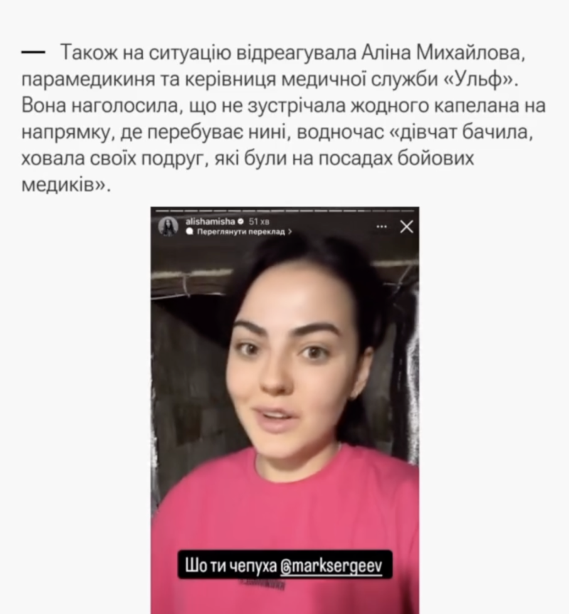 Его слова вызвали бурную реакцию со стороны женщин-парамедиков, которых в свою очередь возмутили подобные заявления. Одна из них записала видеообращение и предложила Сергееву отправиться на фронт и заменить женщин, которых он обвиняет в "непорядочном поведении".
