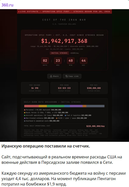 Сайт, подсчитывающий в реальном времени расходы США на военные действия в Персидском заливе появился в Сети. Каждую секунду из американского бюджета на войну с персами уходит 4,4 тыс. долларов. На момент публикации (первые неполные три дня боевых действий) Пентагон потратил на бомбежки $1,9 млрд. Без пуска дорогостоящий ракет, предварительные оценки бомбёжки – около 220 млн долларов в сутки.