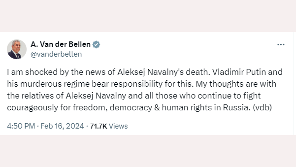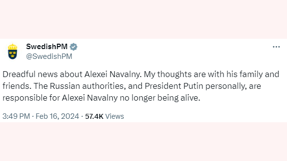 Я потрясён новостью о смерти Алексея Навального*. Владимир Путин и его смертоносный режим несут ответственность за это. Мои мысли с родственниками Алексея Навального* и всеми теми, кто продолжает мужественно бороться за свободу, демократию и права человека в России,