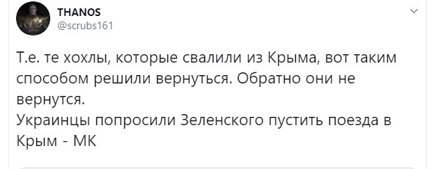 "Т.е. те, которые свалили из Крыма, вот таким способом решили вернуться. Обратно они не вернутся", - счёл пользователь "Твиттера" @scrubs161.