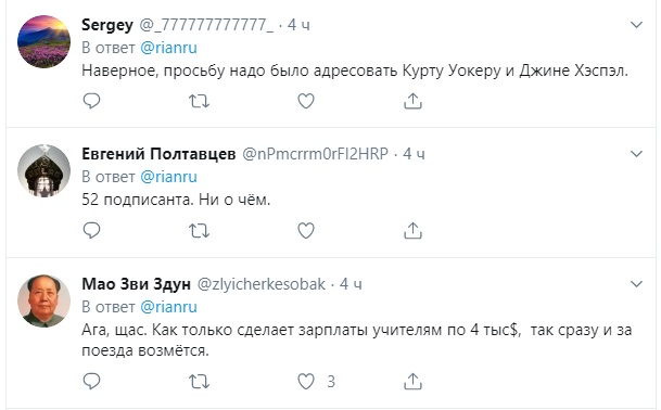 "Ага, щас. Как только сделает зарплаты учителям по $4 тысячи, так сразу и за поезда возьмётся", - парировал автору петиции @zlyicherkesobak.