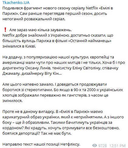 В "Эмили в Париже" имеем карикатурный образ украинки, который неприемлем и оскорбителен. Такими будут видеть украинцев за границей? Которые воруют, хотят получать всё бесплатно, бояться депортации? Так не должно быть,