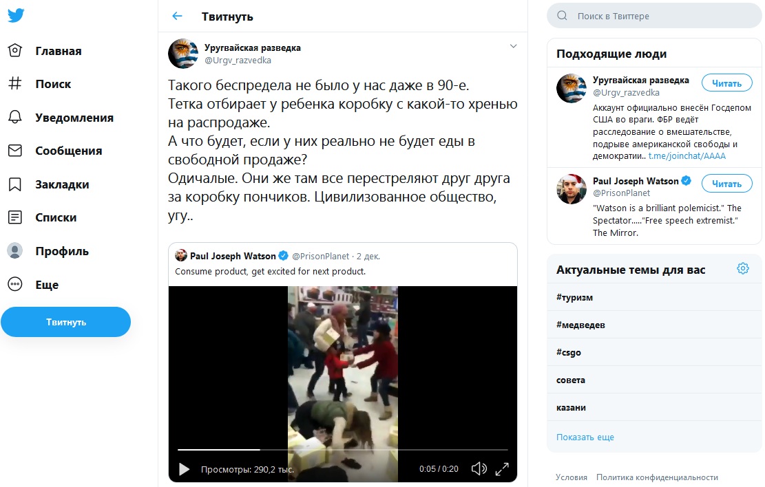 "Такого беспредела не было у нас даже в 90-е... А что будет, если у них реально не будет еды в свободной продаже? Одичалые. Они же там все перестреляют друг друга за коробку пончиков. Цивилизованное общество, угу", - комментирует видео в Twitter "Уругвайская разведка".