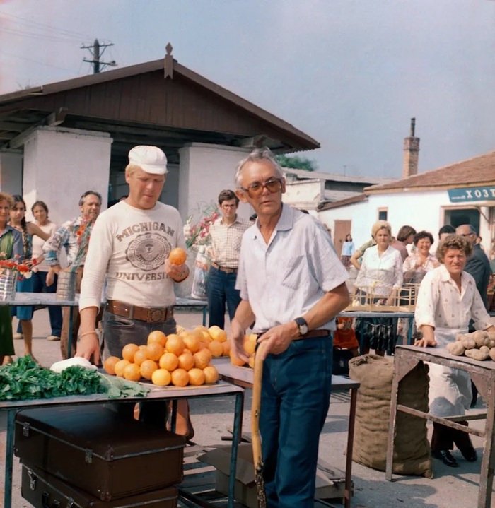 Спортлото-82". Большая часть апельсинов на этом кадре - бутафория. Даже влиятельный режиссёр со связями не смог найти нужное количество фруктов. Зато на Гайдае - модные синие джинсы.