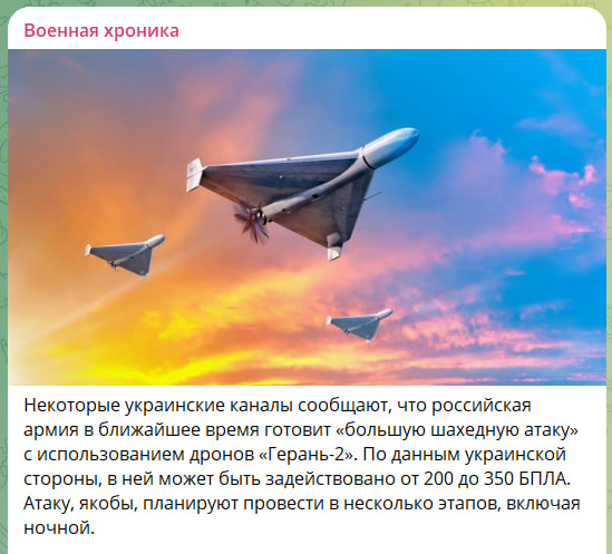 По данным украинской стороны, в ней может быть задействовано от 200 до 350 БПЛА. Атаку якобы планируют провести в несколько этапов, включая ночной.