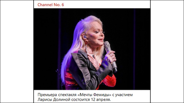 Премьера спектакля "Мечты Фемиды" с участием Ларисы Долиной состоится 12 апреля. Скриншот: ТГ-канал Chanel No.6