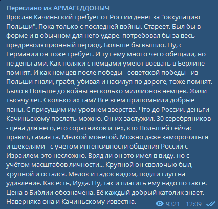"30 сребреников - цена для него, его соратников и тех, кто Польшей сейчас правит, самая та. Мелкой монетой. Можно даже заморочиться и шекелями - с учётом интенсивности общения России с Израилем это несложно", - пояснил политолог.