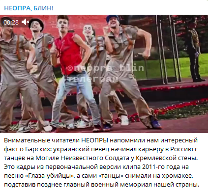 Журналистка показала кадры из первоначальной позорной версии клипа 2011 года на песню "Глаза-убийцы". Барских танцевал на фоне хромакее, позже ему подставили в качестве фона Могилу Неизвестного Солдата.