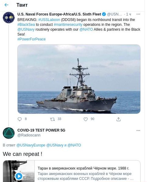"Мы можем повторить!" - написал @Radioscann, прикрепив к твиту видео тарана американских кораблей в Чёрном море сторожевыми кораблями русских в 1988 году.