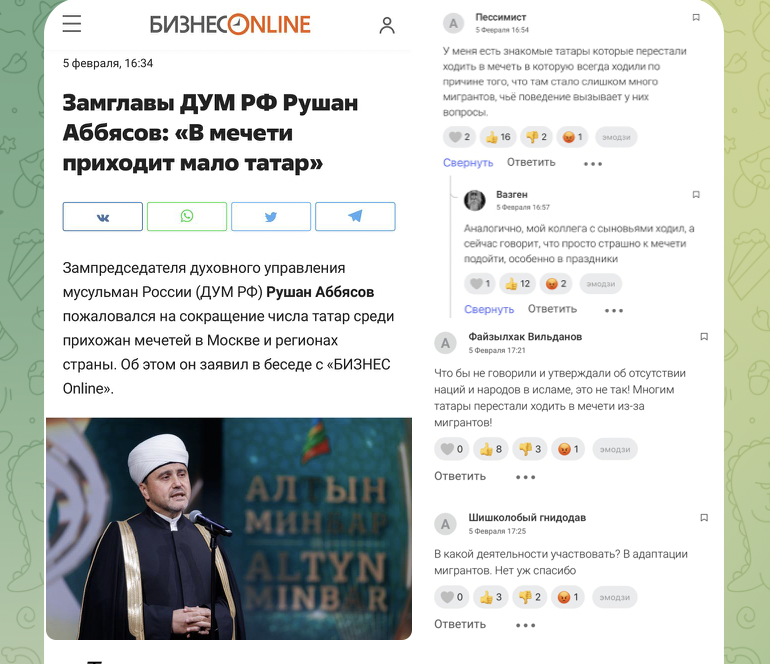 В интернет-обсуждениях это заявление встретило иную реакцию. Многие пользователи связали сокращение числа татар среди прихожан не с языковыми или религиозными причинами, а с изменением состава общин из‑за притока мигрантов. Комментаторы указывают, что знакомые им татары перестали посещать мечети, где раньше бывали постоянно, именно потому, что поведение значительного числа мигрантов вызывает у них вопросы. В отдельных случаях, по словам собеседников, речь идет даже о чувстве опасности при подходе к мечети, особенно в праздничные дни. В этой связи предложение активнее вовлекать татар в деятельность общин воспринимается частью аудитории как призыв к участию в адаптации мигрантов, что вызывает неприятие.
