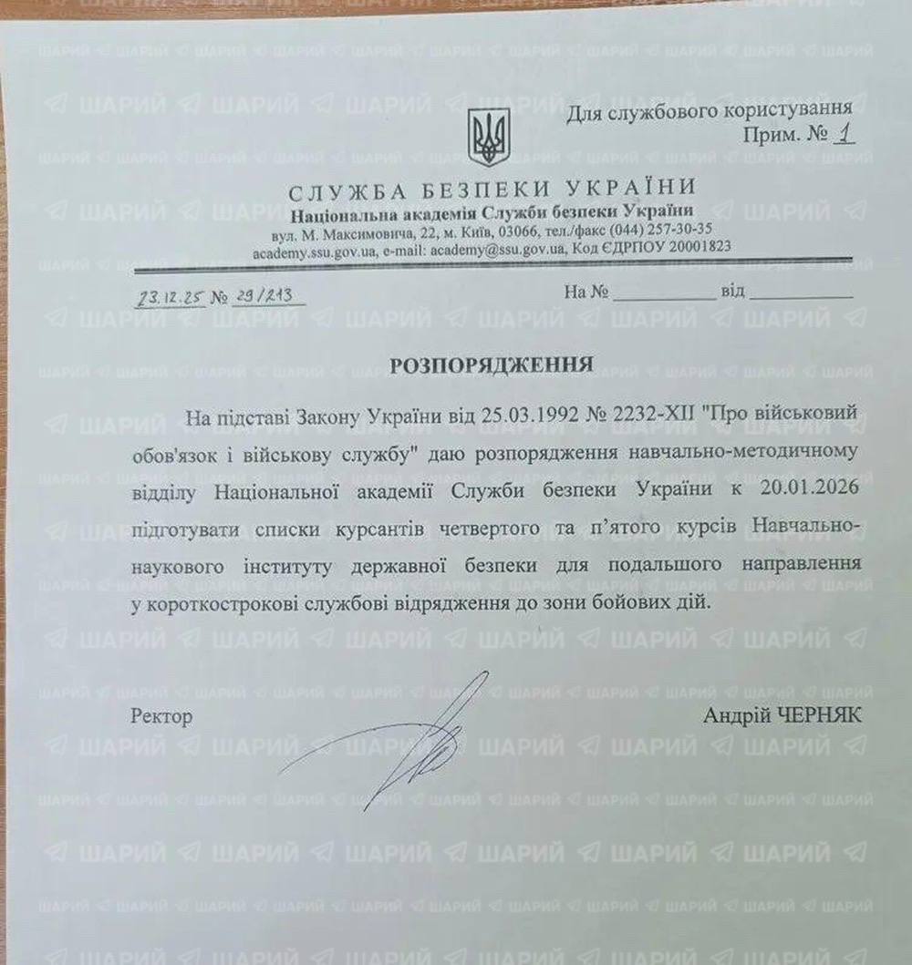 В соответствии с законом Украины от 25.03.1992 №2232-XII "О воинской обязанности и военной службе" даю распоряжение учебно-методическому отделу Национальной академии СБУ к 20.01.2026 подготовить списки курсантов четвёртого и пятого курсов для дальнейшего направления в краткосрочные служебные командировки в зону боевых действий,