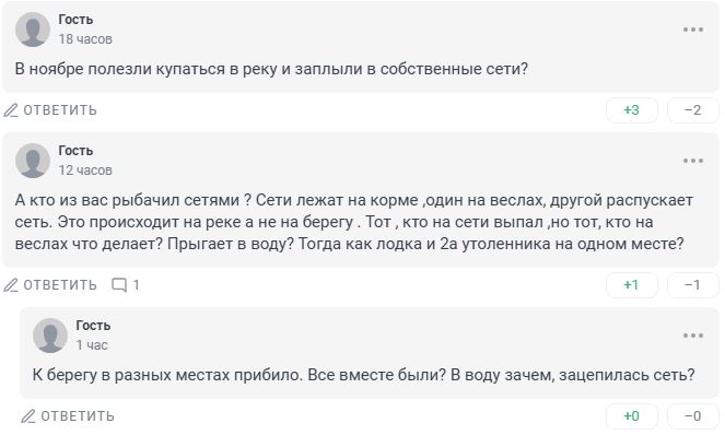 В комментариях к новости люди обратили внимание на то, что рыбаков вероятно корректнее назвать браконьерами, так как они ловили рыбу сетями, а это уже давно запрещено делать. И задались вопросом, как вообще могла произойти трагедия, причём сразу с двумя парами людей?